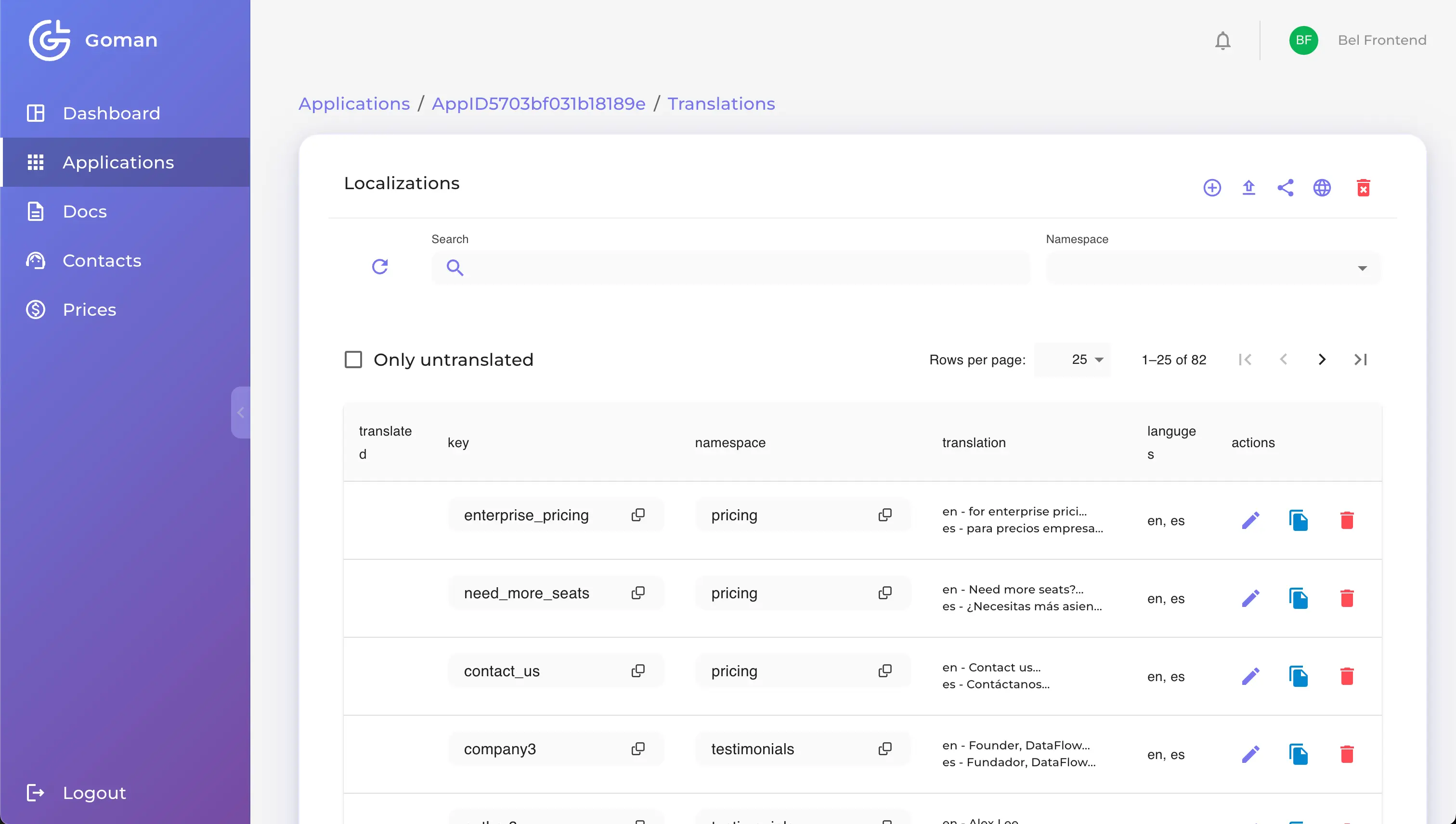 Усе створаныя пераклады можна выгрузіць у фармаце JSON у розных структурах (якія можна выбраць перад спампоўкай). Сэрвіс дазваляе працаваць над лакалізацыямі некалькім карыстальнікам адначасова, дзяліцца доступам з іншымі членамі каманды.