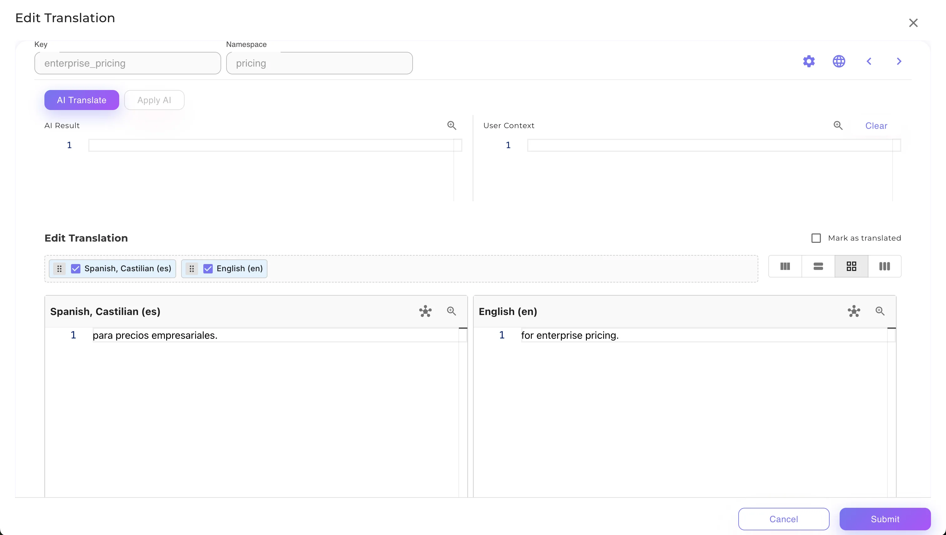 ШІ-перакладчык дазваляе генераваць пераклады з улікам загадзя падрыхтаваных промптаў, што значна паляпшае якасць выніку. Акрамя таго, сэрвіс можа ўлічваць папярэднія пераклады пры стварэнні новых — гэта бывае вельмі карысна. Промпты падтрымліваюць версіяніраванне, і іх можна пераключаць перад выкарыстаннем.